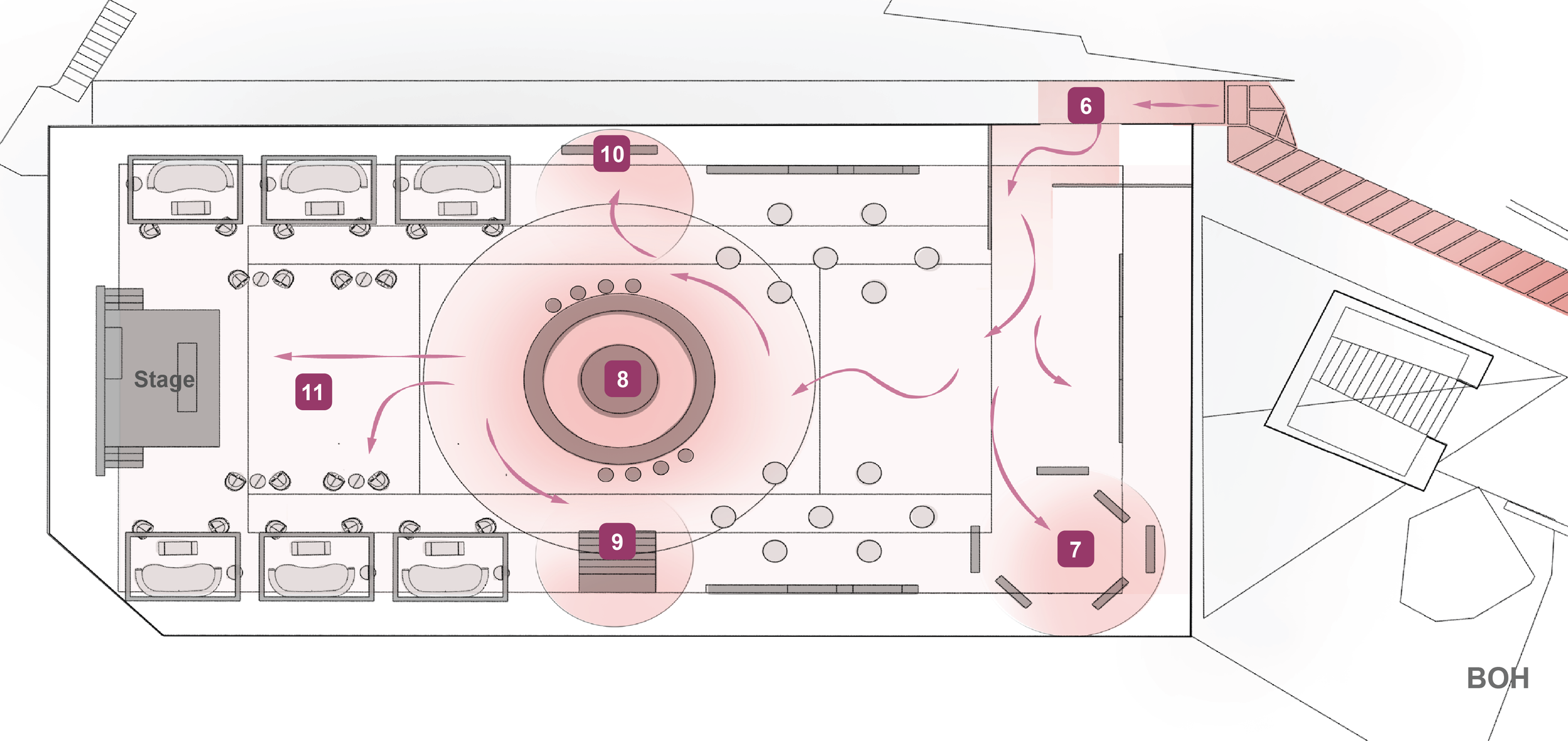 A circle bar with a pyramid fountain of cocktail glasses and Rosado bottles in the center. Cocktail tables surround.